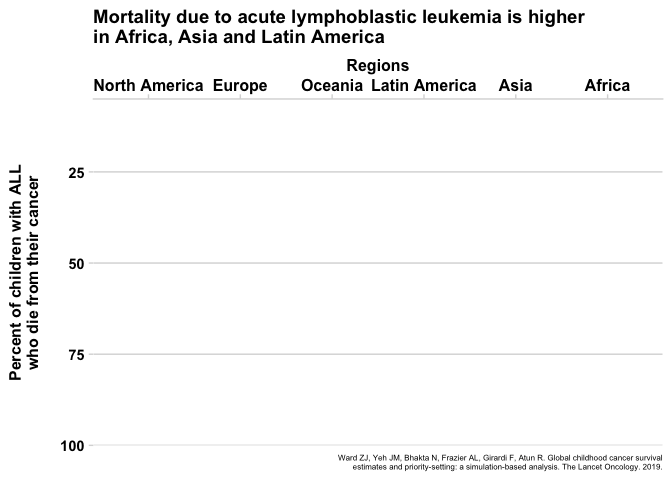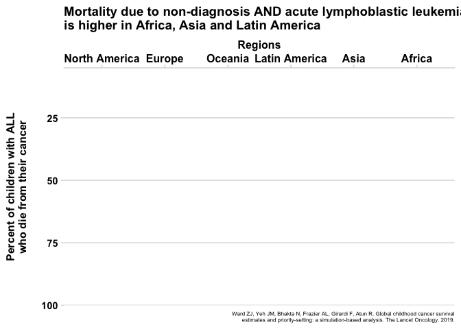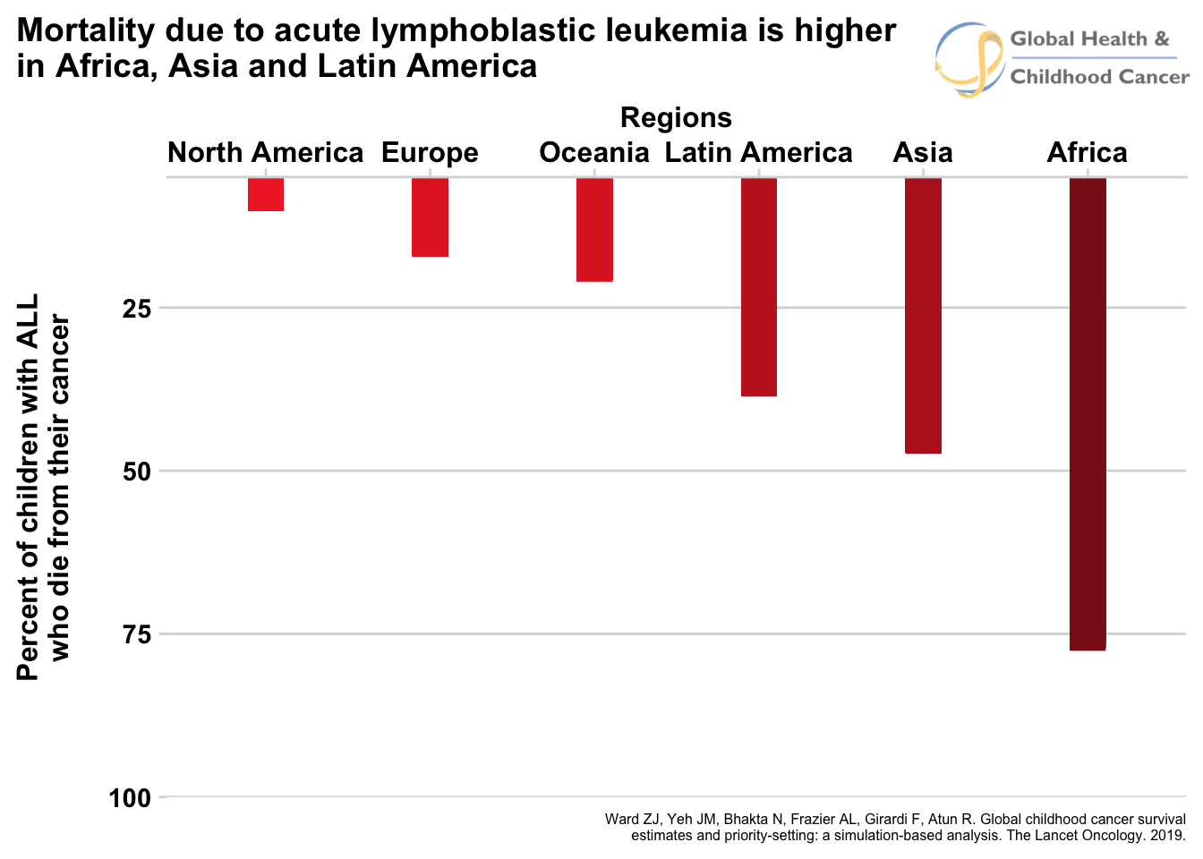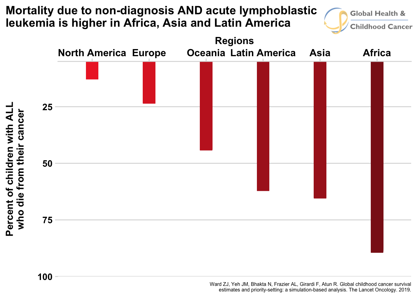 Like the incident cases, this estimate is actually very different in different parts of the world, except variability of the survival estimates is even larger than the incidence estimates. For instance, the 5-year survival percentage in a high-income country like North America is 83% (more than 8 in 10!), but in an economically-challenged region like eastern Africa, only 8% of all patients survive (roughly 1 in 10). Looking broadly across all countries, the trend that emerges from the data is that kids in LMIC have a much, much lower chance of surviving their disease. As an example, figure 4 shows the percent of mortality by region for acute lymphoblastic leukemia, a cancer of the blood.