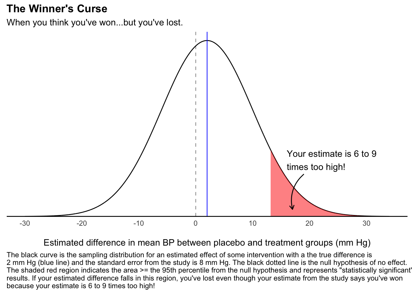 To look for markings of the Curse, first think about how precisely can the outcome of interest be measured. Can it be measured precisely like a physics experiment? Or is there expected noise in the measurement, like measuring blood pressure in a screaming 2-year-old? If the outcome tends toward the imprecise range of the spectrum, the Curse is more likely. Also estimate for yourself a range of plausible effect sizes from the intervention being studied. If you think most plausible effect estimates are small, again the Curse is more likely. Finally think about how large is the possible measurement error compared to the true effect. If the supposed measurement error is many times larger than the plausible true effect size (like 8:2 in our example), the Winner’s Curse is going to haunt any of your “significant” findings.